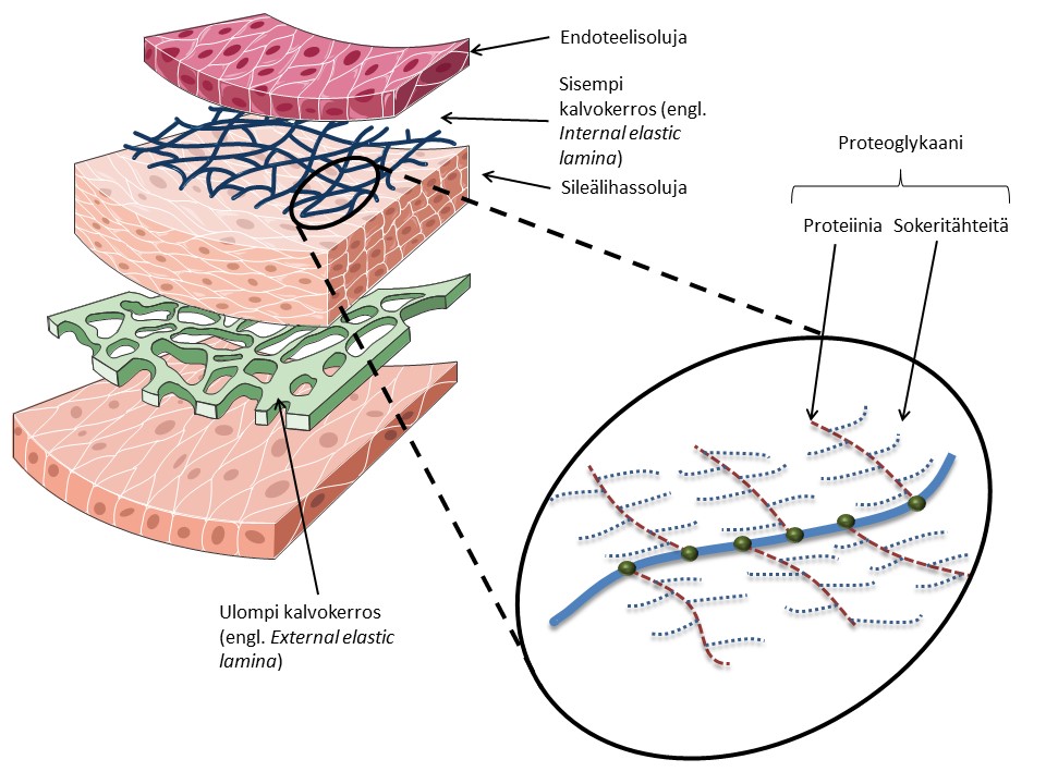 Aikaisemmissa kirjoituksissa hyppäsin suoraan siihen, minne hiukkaset takertuvat eli proteoglykaaniverkkoon. Tätä kuitenkin edeltää valtimoiden sisimmän solukerroksen eli endoteelin ylitys. Tässä vielä kuva aikaisemmasta kirjoituksesta: