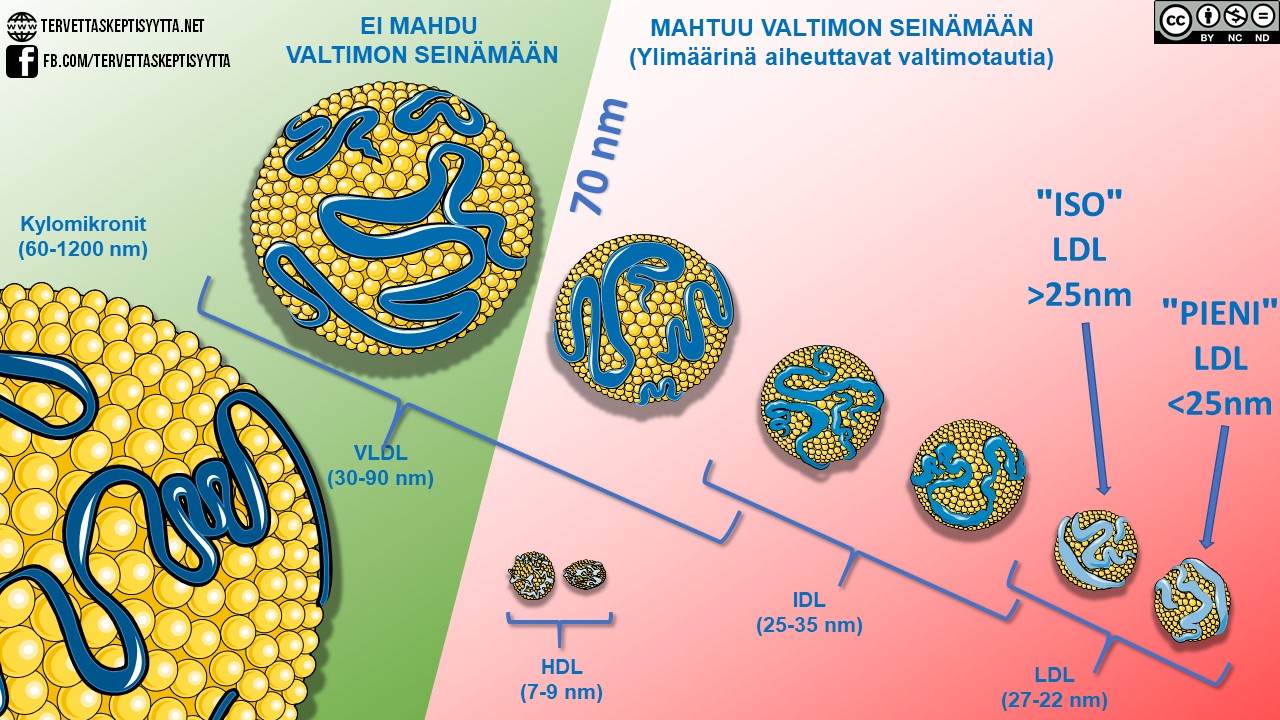 Jos tässä vaiheessa pää on jo pyörällä erikokoisista lipoproteiineista ja niiden lyhenteistä, tässä yhteenveto, mihin olen piirtänyt erikokoiset lipoproteiinit, niiden koot ja tuon aterogeenisen kokorajan: